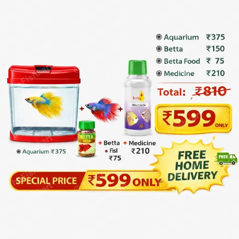 2.5L aquarium + betta fish + food + medicine combo at just ₹599 with free home delivery